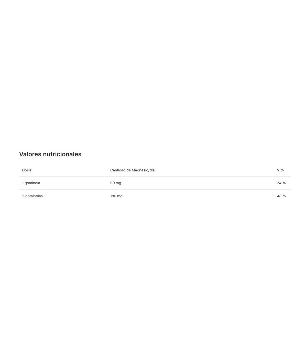 Edulcorantes(Jarabe de maltitol y jarabe de sorbitol), Sal magnésica del acido cítrico (Magnesio 11,20%), Gelificante (Pectina), Edulcorante(Sorbitol), Acidulante(Ácido cítrico), Aroma natural , Concentrado de spirulina (Arthorospira platensis), Aceite vegetal de coco (Cocos nucifera L.), Colorante (Antocianidinas), Corrector de la acidez (Citrato de trisodio), Agente de recubrimiento (Cera de carnauba)