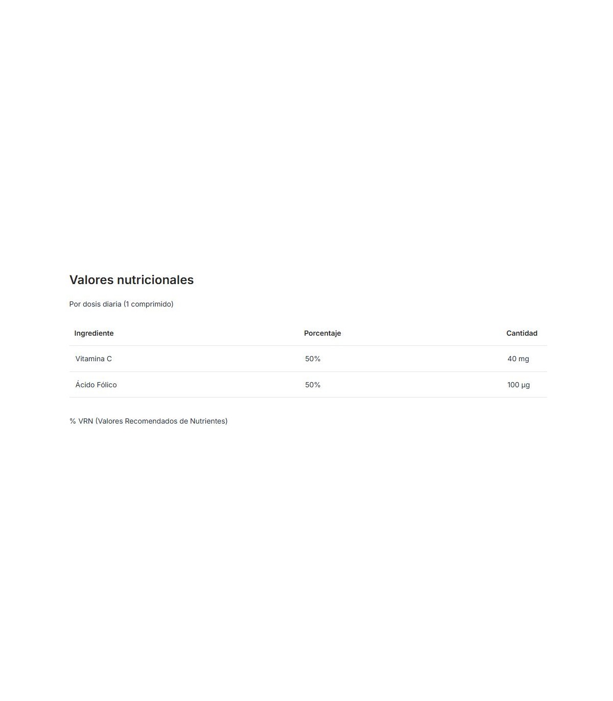 D-Manosa 300 mg , Agente de carga(Celulosa Microcristalina), Extracto seco de Arándano Rojo(Fruto) (Vaccinium macrocarpon Ait.,Proantocianidinas tipo A, PAC 40%)150 mg, Fructooligosacáridos 50 mg, Ácido Ascórbico(Vitamina C)40 mg, Agente de carga(Sal magnésica de ácido graso), Aglutinante(Hidroxipropilmetilcelulosa), Antiaglomerante(Dióxido de silicio), Probióticos(Almidón de maíz, Maltodextrina de maíz, Fructooligosacáridos, Inulina, Dextrina de maíz, Cloruro de potasio, Proteina vegetal hidrolizada, Sulfato de magnesio), Bifidobacterium lactis W51, Bifidobacterium lactis W52, Enterococcus faecium W54, Lactobacillus acidophilus W22, Lactobacillus paracasei W20, Lactobacillus plantarum W1, Lactobacillus plantarum W21, Lactobacillus salivarius W24, Lactococcus lactis W19, Enzima amilasa, Aroma de Vainilla, Sulfato de manganeso)5 mg, Ácido pteroilmonoglutámico(Ácido fólico)100 µg