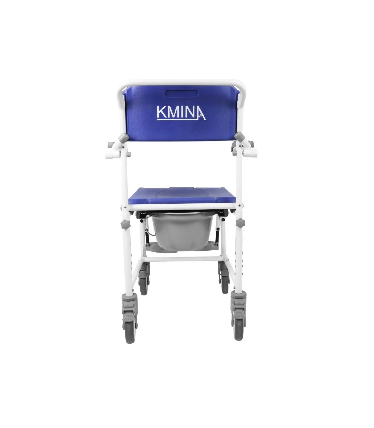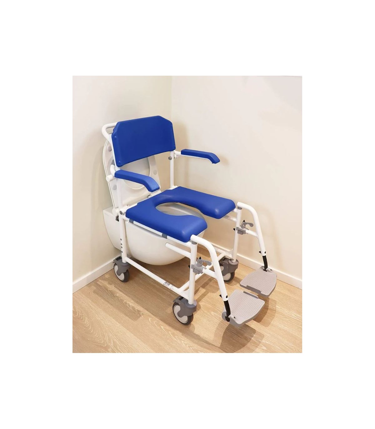 DIMENSIONES: Fabricada en aluminio, esta silla de ruedas para baño es muy compacta, práctica y duradera para un uso intensivo. Sus dimensiones son 55,5 cm de ancho, 88,5 cm de fondo con reposapiés y una altura de asiento de 53 cm. Para su uso en WC la altura máxima del inodoro debe ser de 43 cm.