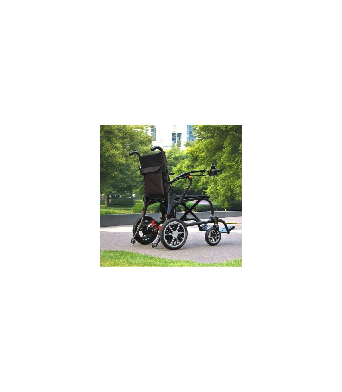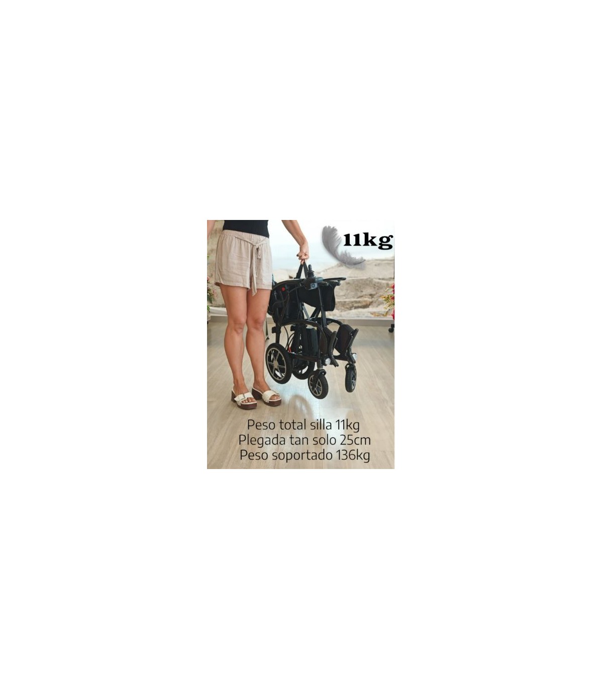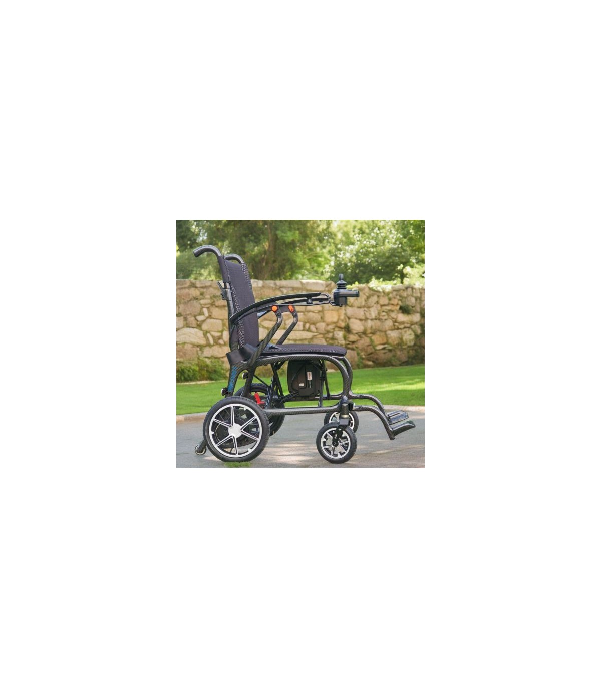 El peso de la estructura de la silla es únicamente de 11kg siendo la silla eléctrica más ligera del mercado. La batería de litio pesa 1,3kg.