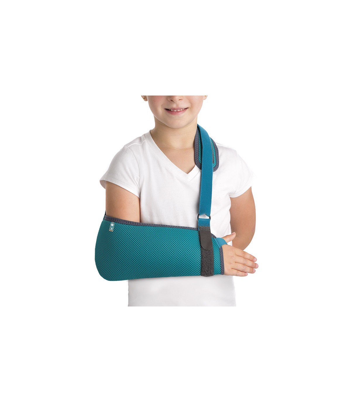 Cabestrillo infantil ortopédico para inmovilizar el brazo confeccionado en tejido transpirable de panal y rizo.